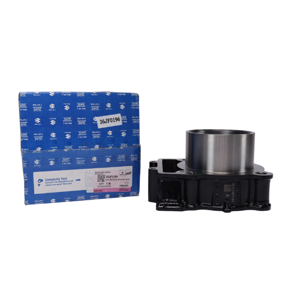 Kit de bloque cilindro con pistón original Bajaj referencia 36JF0196. Bloque de diseño compacto en hierro fundido con acabado negro. Pistón de aluminio incluido con sus respectivos anillos.