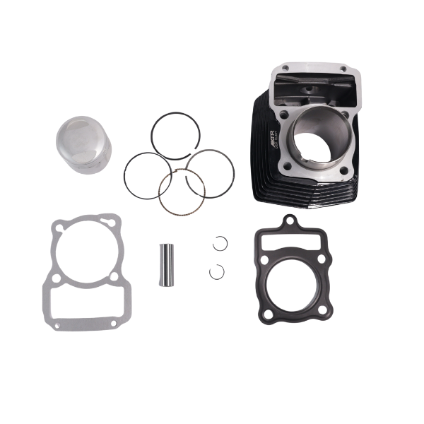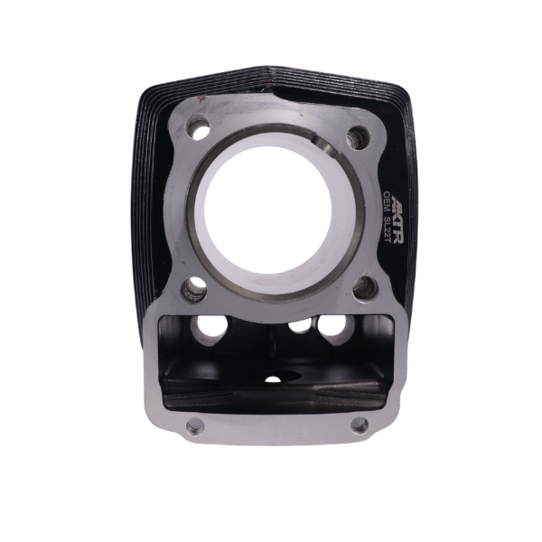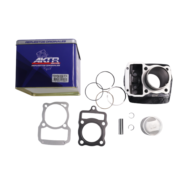 Kit de cilindro original AKT Motos referencia OEM SL22T con pistón completo. Cilindro fabricado en hierro fundido con acabado negro brillante, aletas de refrigeración de alta eficiencia y boquilla lateral integrada. Pistón de aluminio de alta precisión con anillos, empaques de culata y base, pin de pistón y seguros.
