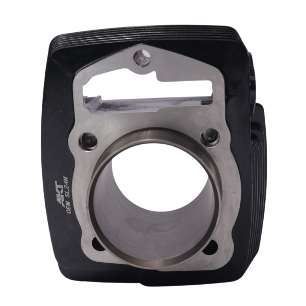 Kit de cilindro original AKT Motos referencia OEM SL24N con pistón completo. Cilindro fabricado en hierro fundido con acabado negro y aletas de refrigeración de alta eficiencia. Pistón de aluminio de alta precisión incluido con sus anillos instalados, empaques de culata y base, pin de pistón y seguros.