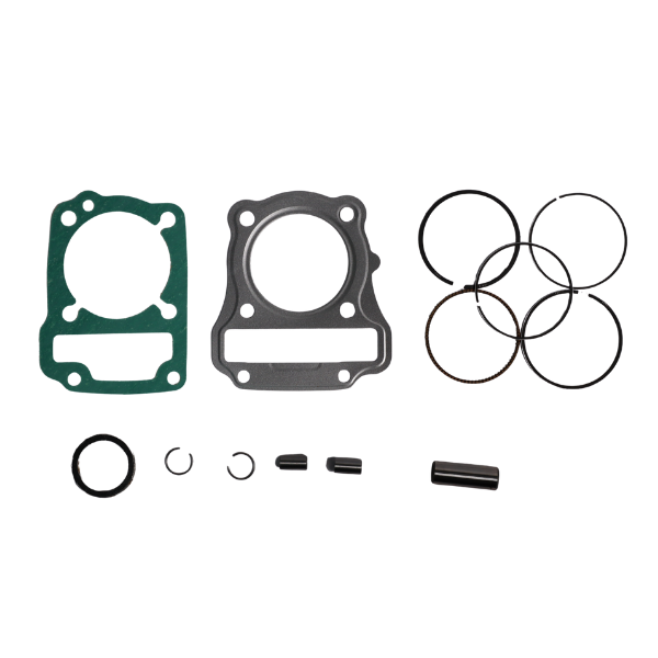 Kit de cilindro original Honda referencia 01210-K14-910 con pistón completo. Cilindro en aluminio fundido con acabado negro y aletas rectangulares de refrigeración de alta eficiencia. Pistón de aluminio forjado con estrías laterales para mayor disipación térmica (ref. K23), anillos, empaques de culata (verde) y base (gris), pin de pistón, seguros y rodamiento de biela. Made in India.