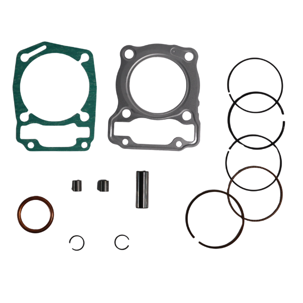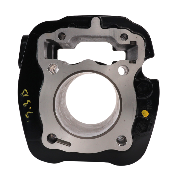 Kit de cilindro original Honda referencia 01210-K1L-D00 con pistón completo. Cilindro en aluminio fundido con acabado negro, aletas de refrigeración horizontales de alta eficiencia y boquilla lateral de admisión de gran diámetro. Pistón de aluminio forjado USHA (ref. E) con anillos, empaques de culata (verde) y base (gris), pin de pistón, seguros y rodamiento de biela. Fabricado en India.