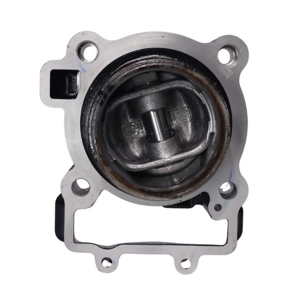 Ensamble de bloque cilindro con pistón original Bajaj referencia 36JF0208. Diseño compacto y robusto en hierro fundido sin aletas externas, ideal para motores de enfriamiento por aceite o líquido. Pistón de aluminio incluido con anillos instalados. Acabado negro de alta durabilidad.