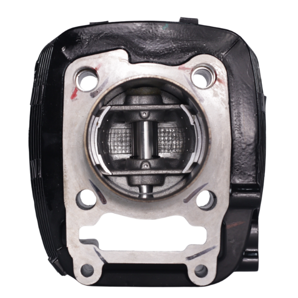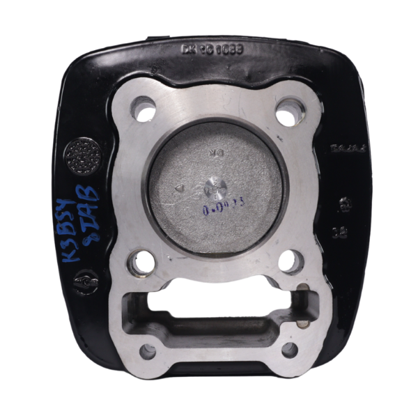 Ensamble de bloque cilindro con pistón original Bajaj referencia DK101625. Fabricado en hierro fundido con aletas horizontales de refrigeración y acabado negro brillante de larga duración. Pistón de aluminio incluido con anillos instalados.